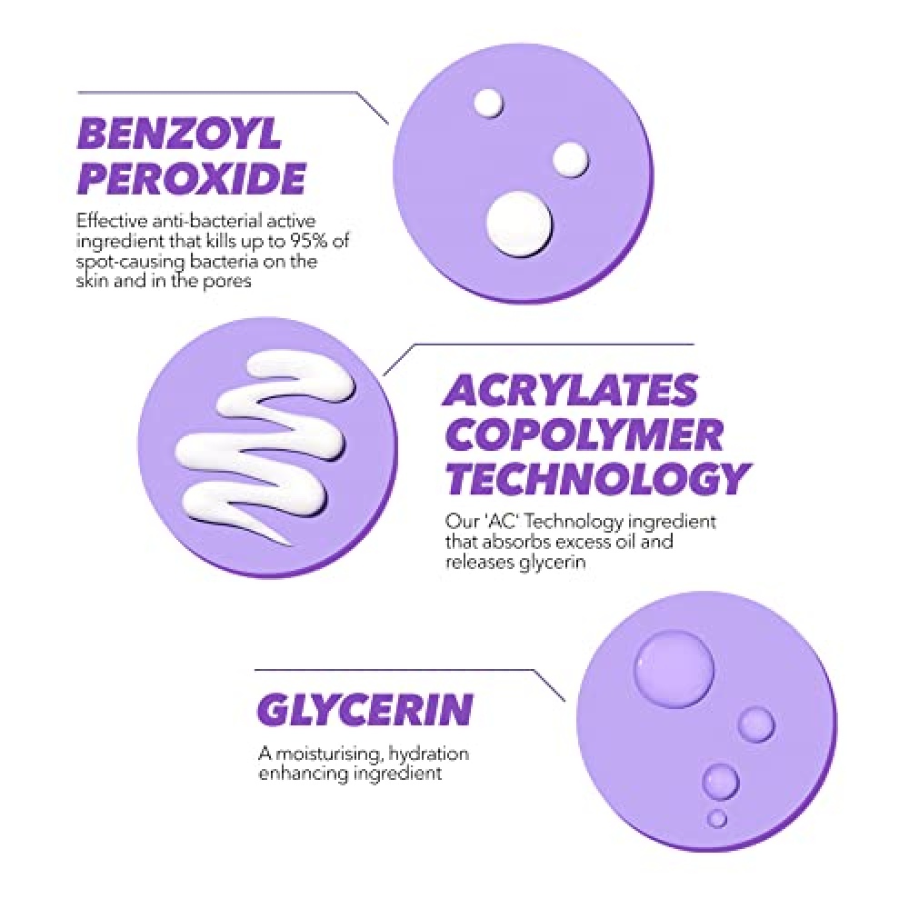 - ACTIVE INGREDIENT Contains 5% benzoyl peroxide; clinically proven to target and reduce spot-causing bacteria by up to 95% in 1 week
