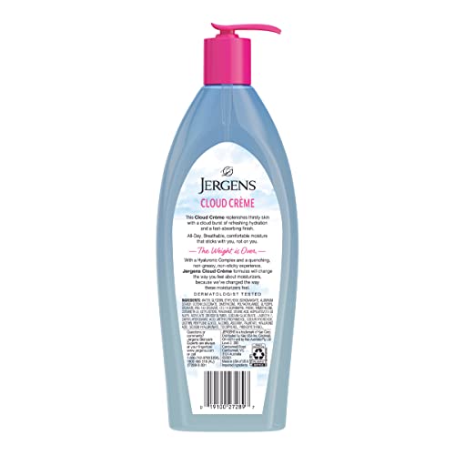 Details: Tired of sticky, tacky lotions that never absorb? Jergens Cloud Créme is a breathable face moisturizer and body lotion for dry skin that provides powerful hydration without the heavy feeling of traditional body lotions. Let your skin breathe with this body moisturizer, infused with Hyaluronic Complex and specifically designed to quench thirsty skin without excess stickiness. This paraben free body lotion glides on smoothly and absorbs fast for all day moisture that sticks with you — not on you. Dermatologist tested, this non-greasy body lotion and face moisturizer for dry skin is both dye and paraben free, for a formula you can trust on your skin. At Jergens, we’ve put all our years of hydration expertise into this non-greasy hand lotion — a new formula in a classic lotion dispenser, a lotion bottle with pump that makes this moisturizer for dry skin ideal for daily use. Use this versatile oil free moisturizer as a dry skin face moisturizer or body lotion that hydrates without stickiness. Satisfaction guarantee. Limitations may apply.