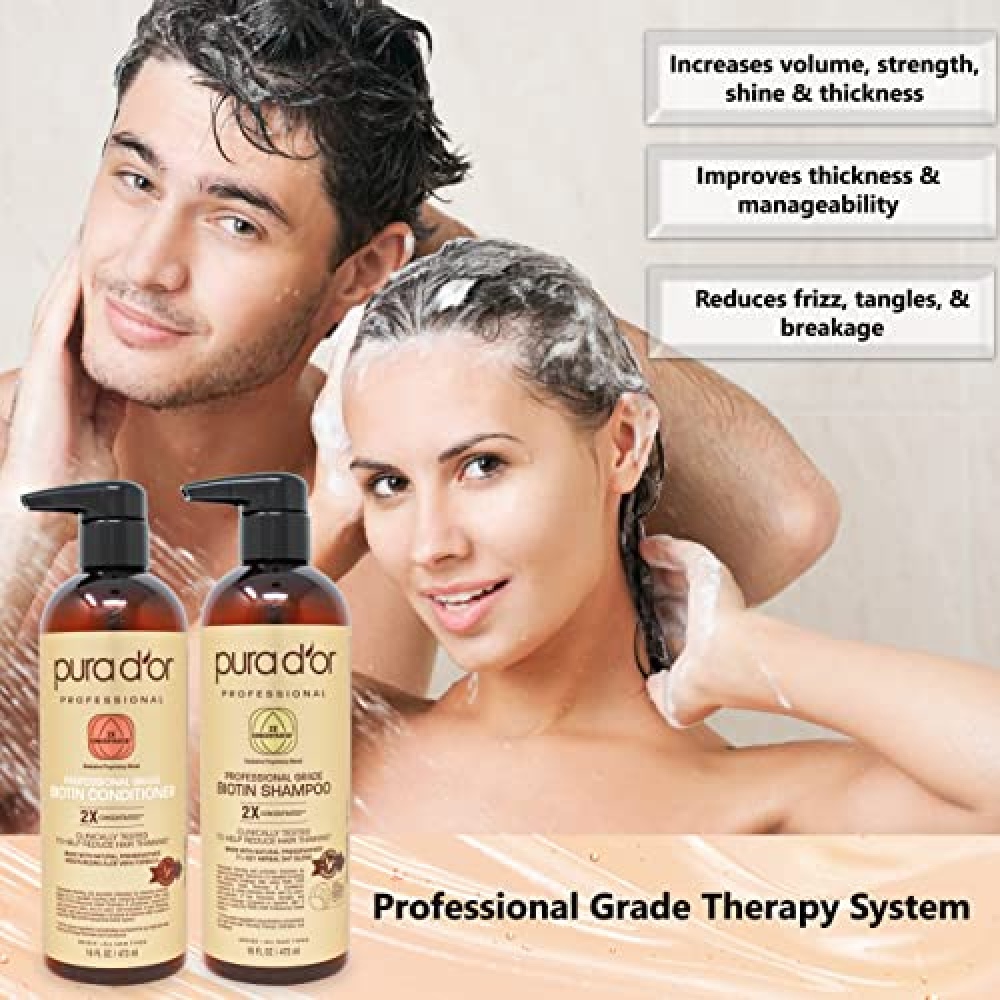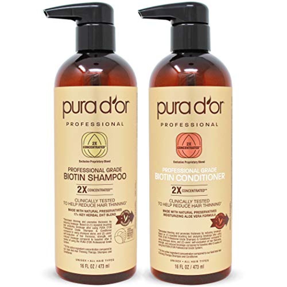 Details: PURA D’OR Professional Grade double concentrated hair growth shampoo and conditioner for thinning hair is clinically tested to strengthen hair, and minimize breakage. It is one of PURA D’OR’s best selling shampoo and conditioner sets because of its double-strength feature that increases volume and thickness of your hair, keeping it moisturized and tangle-free all day long. Our professional shampoo and conditioner include 17 key active ingredients in the natural organic shampoo plant-based preservative system, each with twice the concentration to support and ensure a moisturized and healthier hair from roots to tips without any signs of distress, breakage, or leaving it flat. DHT Blockers such as Saw Palmetto, Nettle extracts, Biotin, He Shou Wu, Red Korean Seaweed, Pygeum Bark Extract, and other exotic herbs to fight hair thinning are part of the proprietary blend. Even with the double concentration formula, our sulfate-free shampoo and conditioner is still safe for our daily routine use on any hair types including natural hair, colored treated or dry and damaged hair, for both men and women. It is free from harsh chemicals and paraben-free. It is hypoallergenic, vegan, environmentally responsible, and cruelty-free.